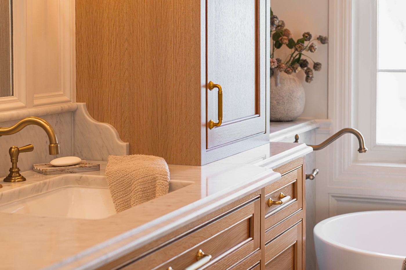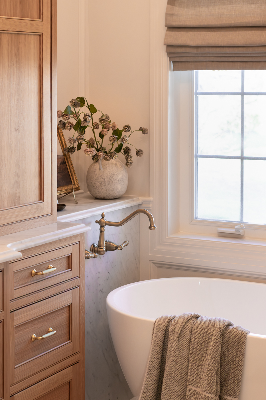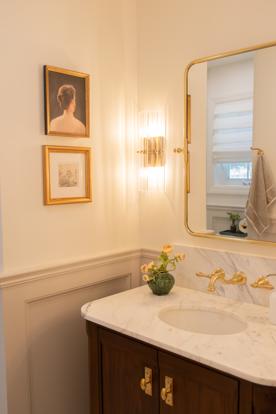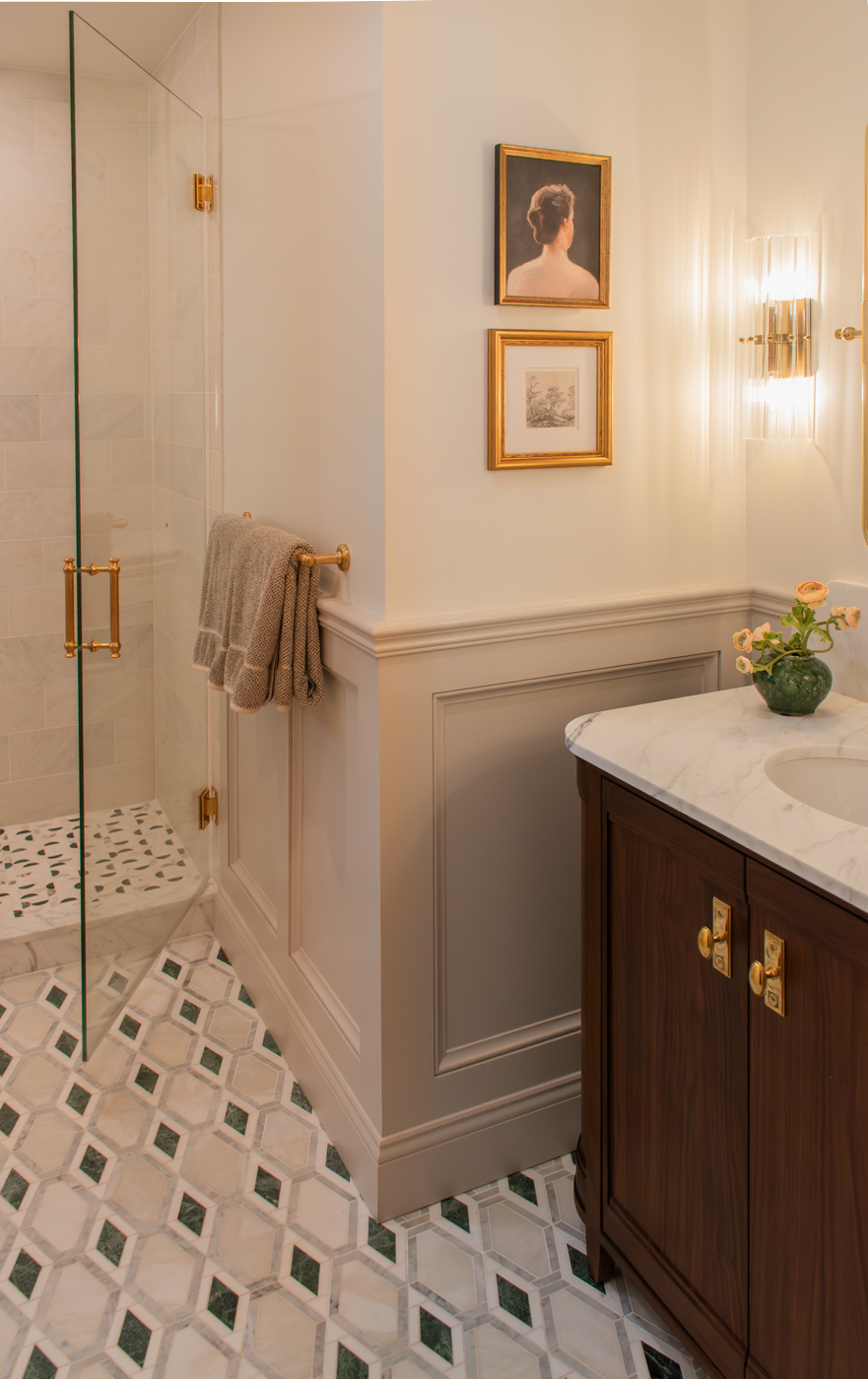 These two bathrooms were thoughtfully redesigned to bring timeless luxury to everyday living. Marble surfaces, warm wood tones, and unlacquered brass accents create a rich, layered feel that feels both polished and welcoming. A marble-clad tub surround adds depth and drama in the primary bath, while touches of green bring freshness and character throughout. Tailored storage and layered lighting complete spaces designed to work beautifully for daily life.