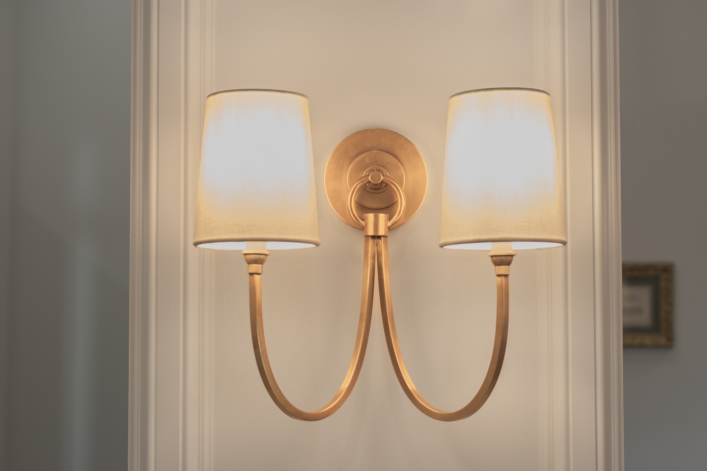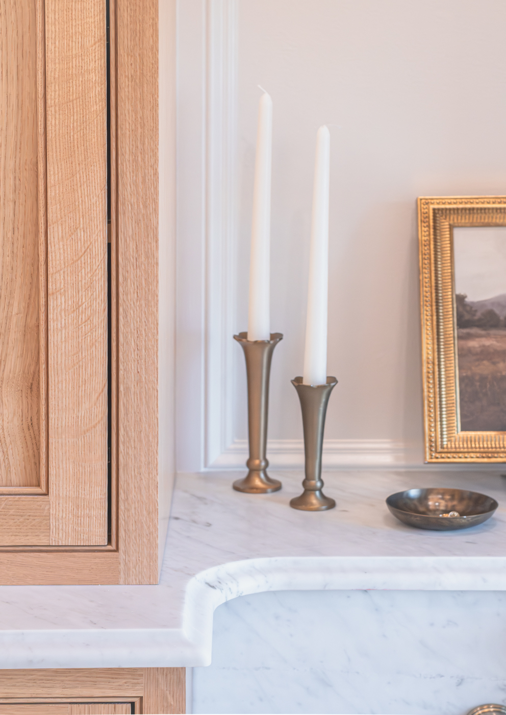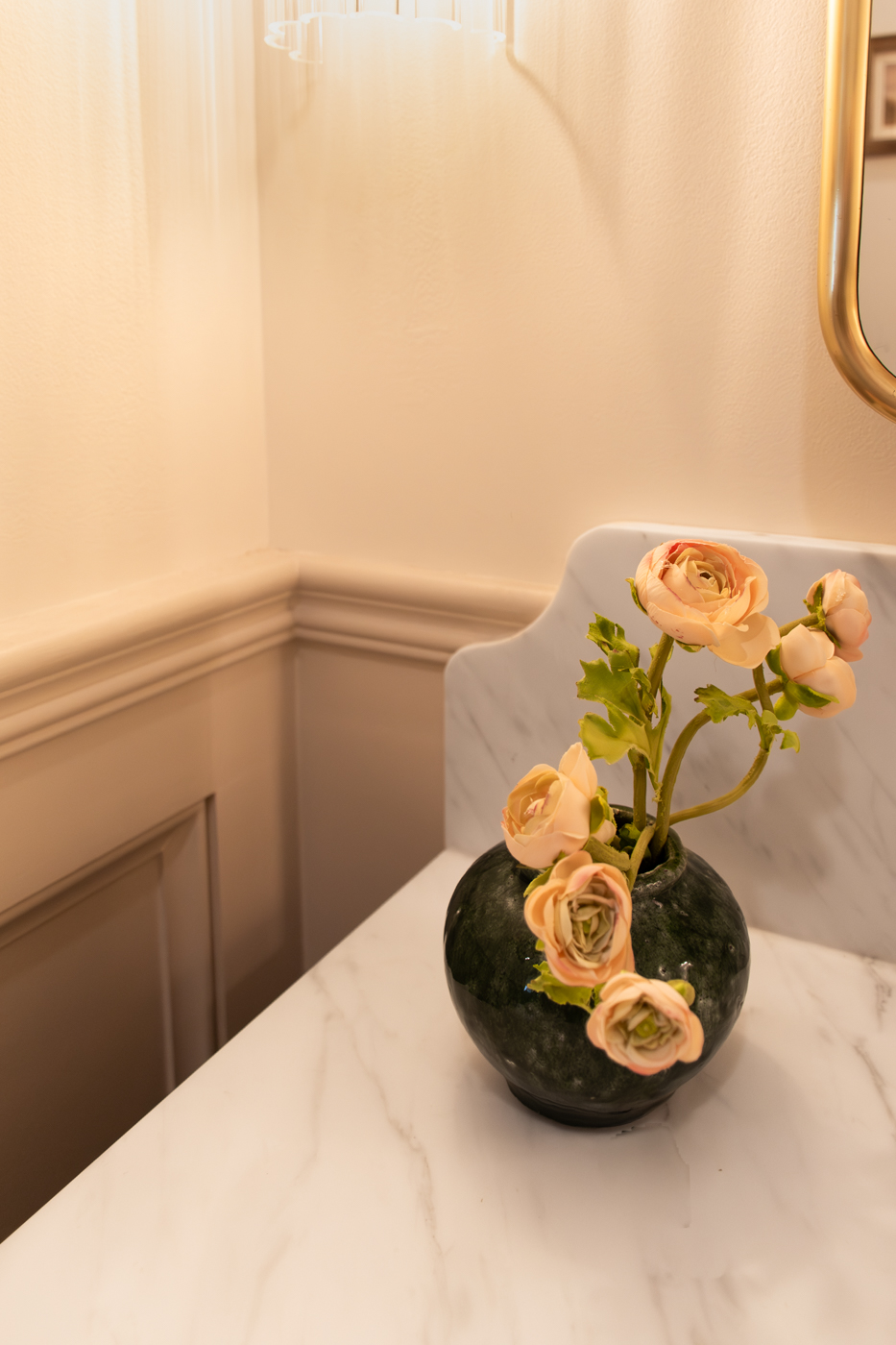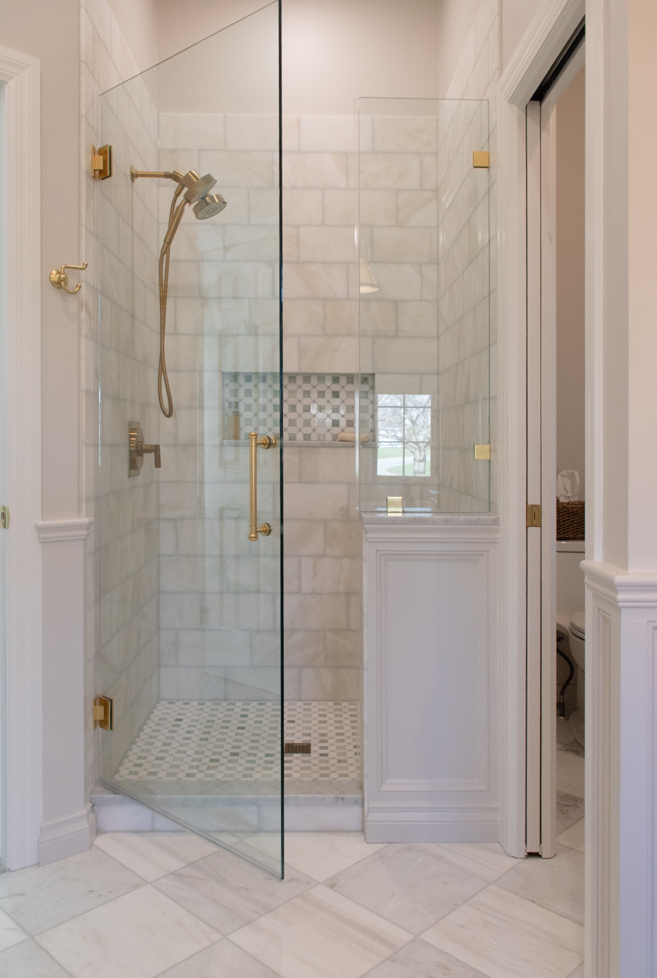 These two bathrooms were thoughtfully redesigned to bring timeless luxury to everyday living. Marble surfaces, warm wood tones, and unlacquered brass accents create a rich, layered feel that feels both polished and welcoming. A marble-clad tub surround adds depth and drama in the primary bath, while touches of green bring freshness and character throughout. Tailored storage and layered lighting complete spaces designed to work beautifully for daily life.