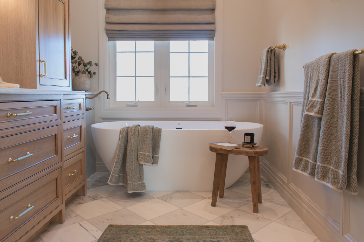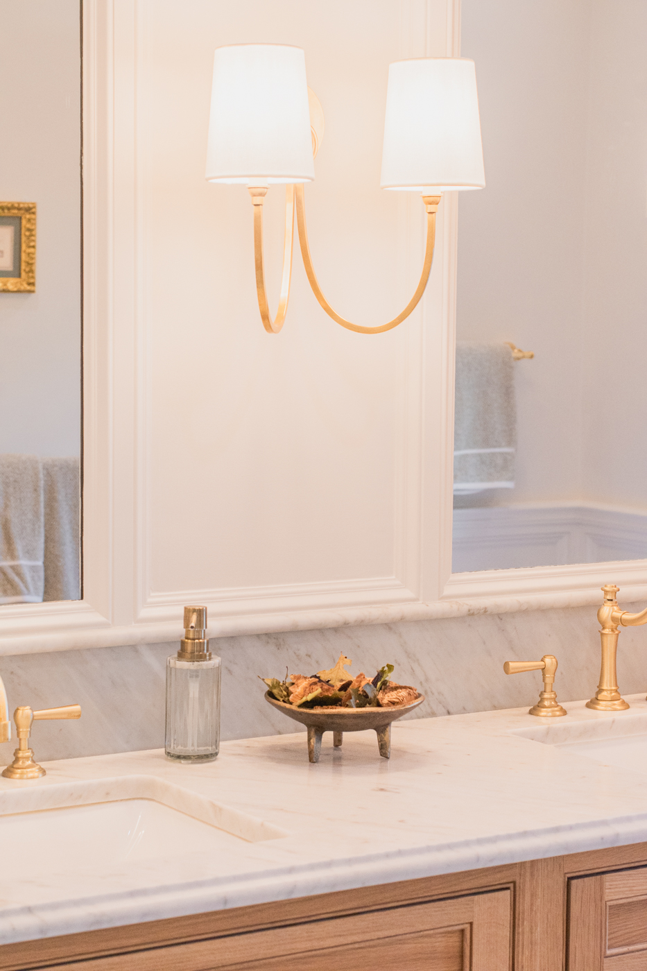 Timeless bathrooms layered in understated luxury.